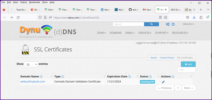 This command generates your "Certificate Signing Request": certreq.csr The text from this file will be copied and pasted into a web form on the Dynu website. |