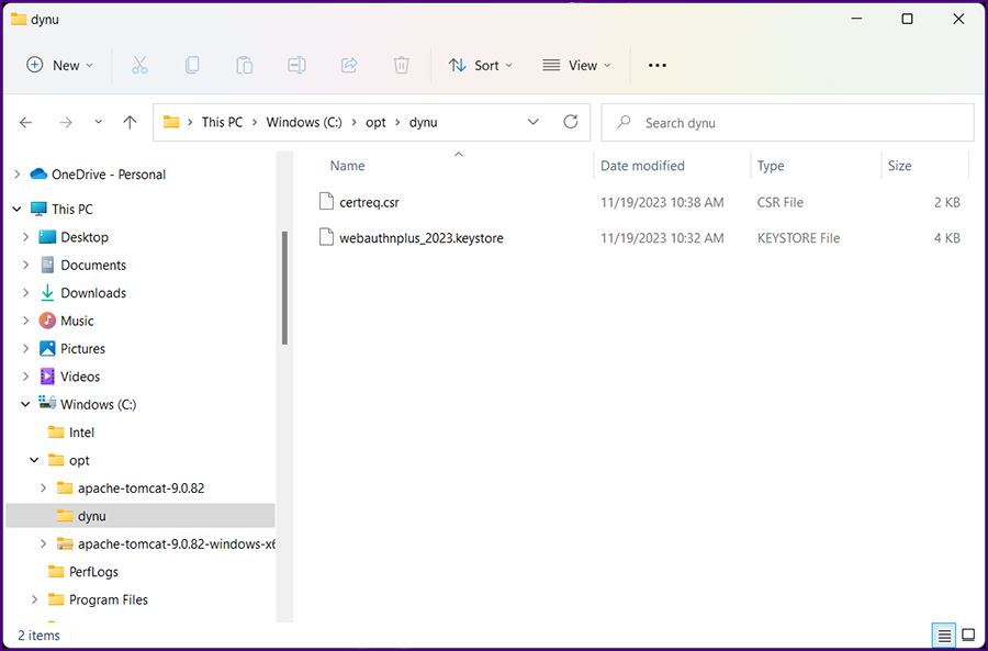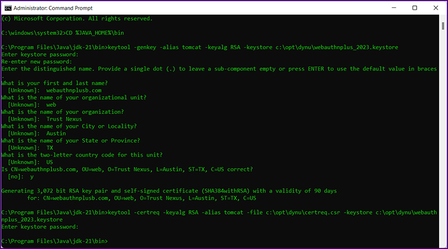 CD %JAVA_HOME%\bin This command takes you to the directory where the Keytool executable is stored. keytool -genkey -alias tomcat -keyalg RSA -keystore c:\opt\dynu\webauthnplus_2023.keystore This command generates the webauthnplus_2023.keystore file. But first it asks you some questions: Enter keystore password: [create a new password] Re-enter new password: [reenter the password] What is your first and last name? [Unknown]: webauthnplus.com [enter the name of your website] What is the name of your organizational unit? [Unknown]: web What is the name of your organization? [Unknown]: Trust Nexus What is the name of your City or Locality? [Unknown]: Austin What is the name of your State or Province? [Unknown]: TX What is the two-letter country code for this unit? [Unknown]: US Is CN=www.webauthnplus.com, OU=web, O=Trust Nexus, L=Austin, ST=TX, C=US correct? [no]: y |