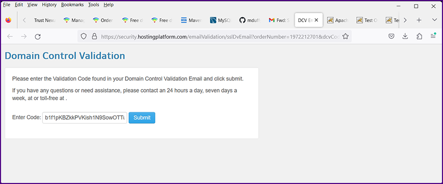 | When you receive your confirmation email click on the link. The "Domain Control Validation" screen will be displayed with the validation code filled out. | ||