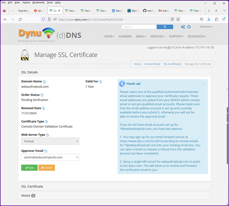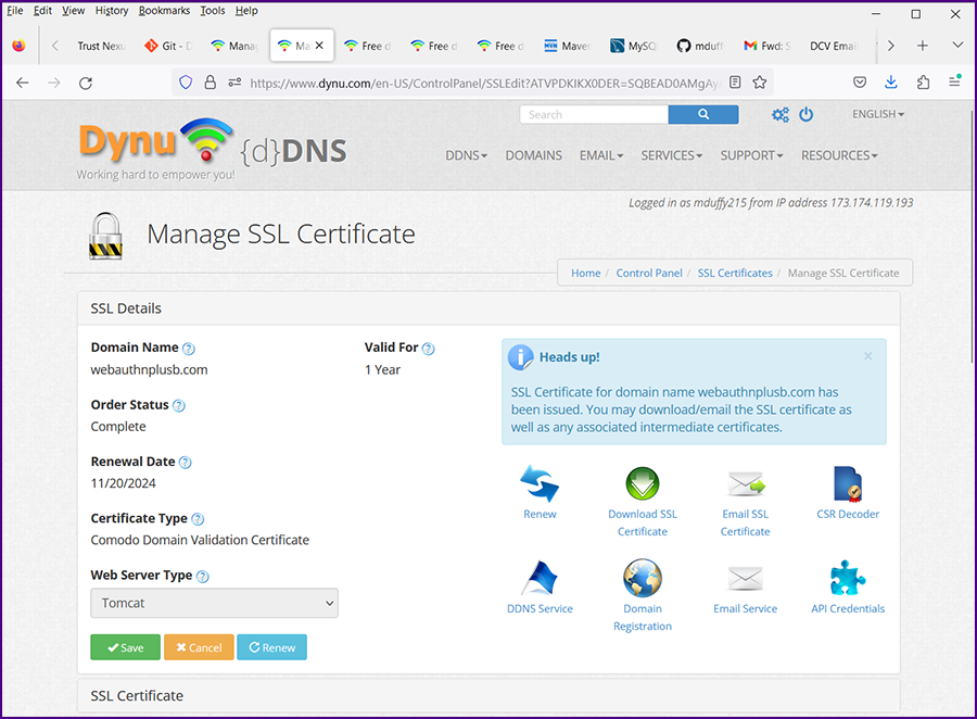 | Click on the "Download SSL Certificate" link and save the zip file to the folder c:\opt\dynu. If the file name is not already in this format, rename the file [your domain]_2023. Most certs are good for a year; adding the "_2023" will help keep things organized. Unzip the file. | ||