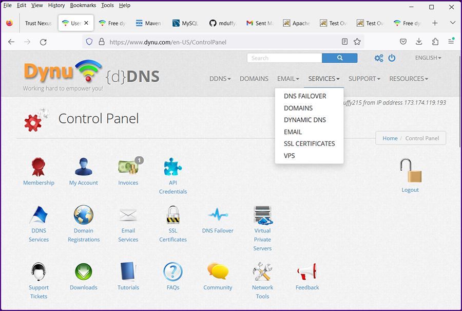 | Log in to your Dynu account; the "Control Panel" is displayed. | ||