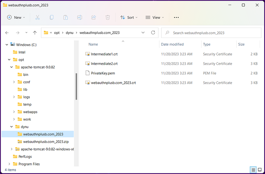 keytool -import -alias intermed1 -keystore c:/opt/dynu/webauthnplus_2023.keystore -trustcacerts -file C:/opt/Dynu/webauthnplus.com_2023/Intermediate1.crt keytool -import -alias intermed2 -keystore c:/opt/dynu/webauthnplus_2023.keystore -trustcacerts -file C:/opt/Dynu/webauthnplus.com_2023/Intermediate2.crt keytool -import -alias tomcat -keystore c:/opt/dynu/webauthnplus_2023.keystore -trustcacerts -file C:/opt/Dynu/webauthnplus.com_2023/webauthnplus.com_2023.crt After the final command the following message should be displayed: "Certificate was added to keystore." |