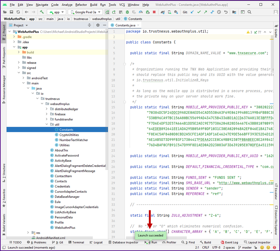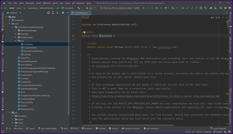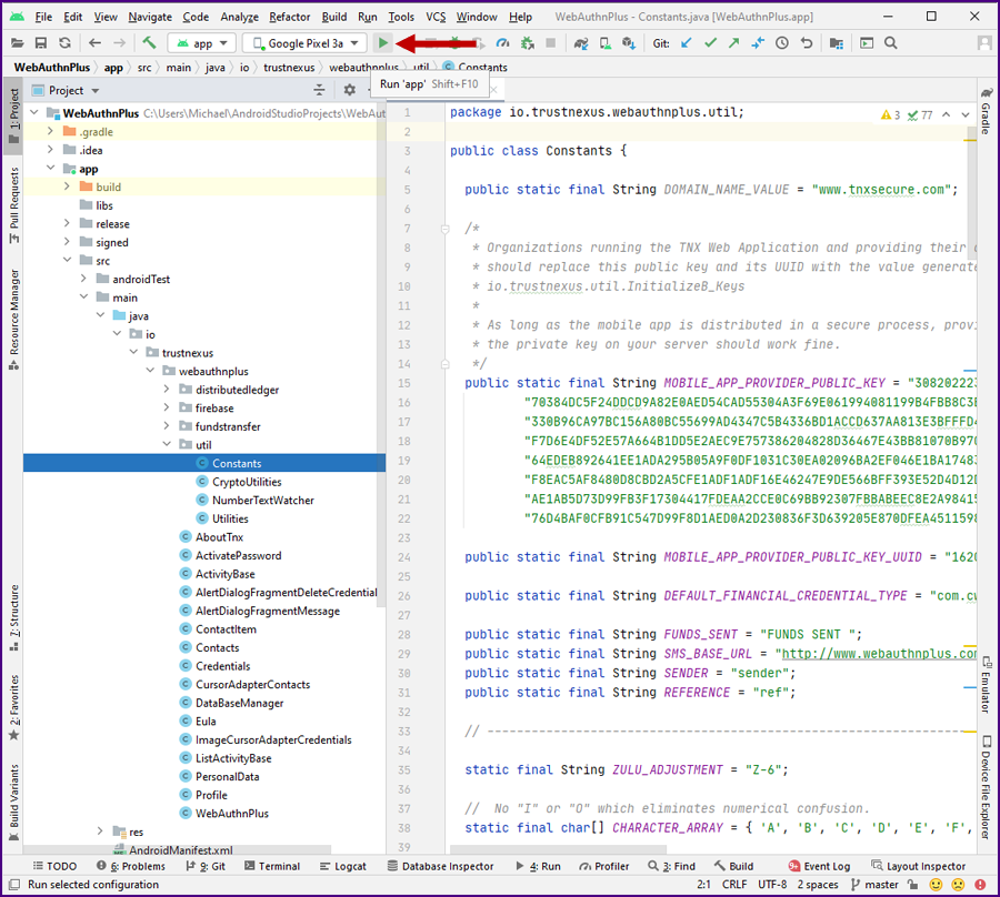 In the "Project" directory, expand "app >> java >> io.tnxsecure.webauthnplusb >> util". Double click on Constants.