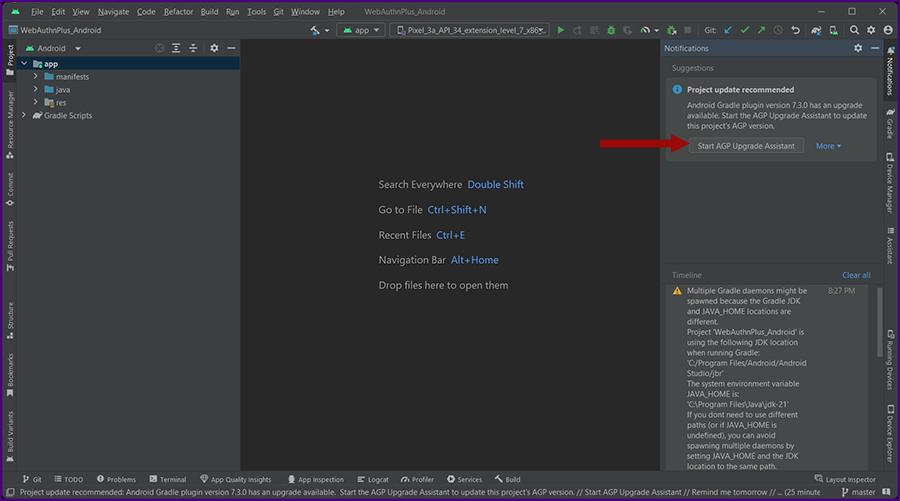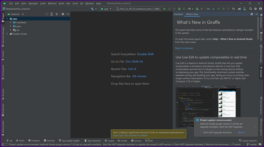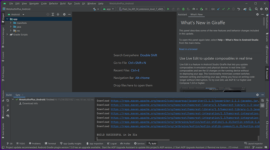 The project name is displayed in the upper left: "WebAuthnPlus_Android" project.