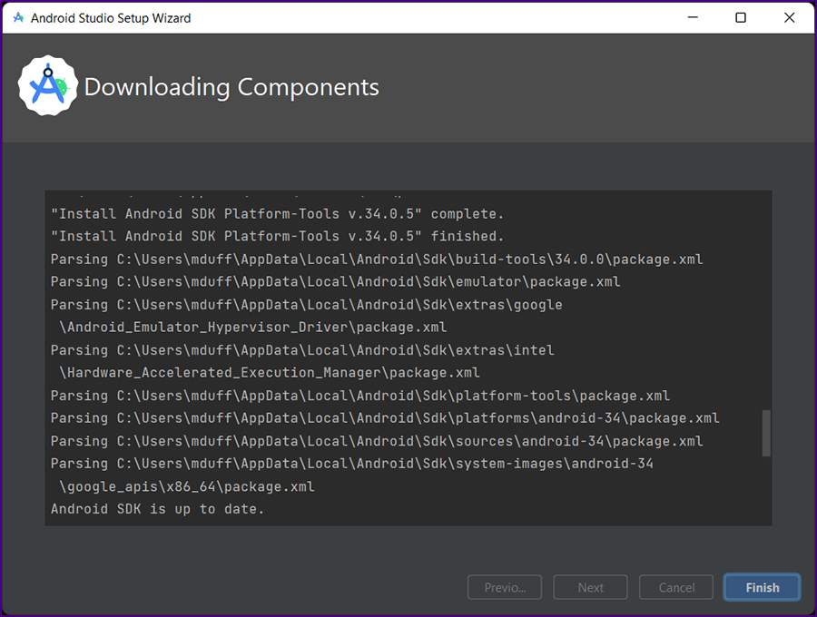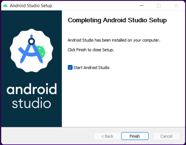 The "Completing Android Studio Setup" screen is displayed.