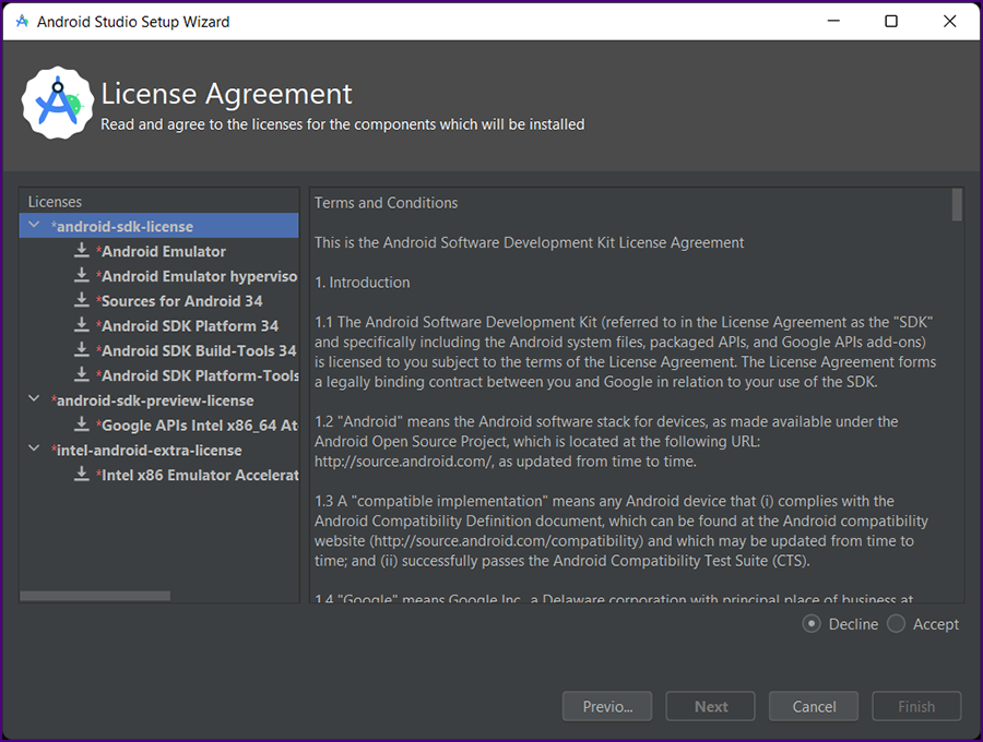 Accept all thre license agreements and click "Finish".