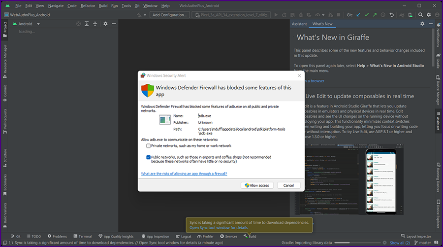 The Android Studio IDE will be displayed. You may see a warning from Windows Defender.